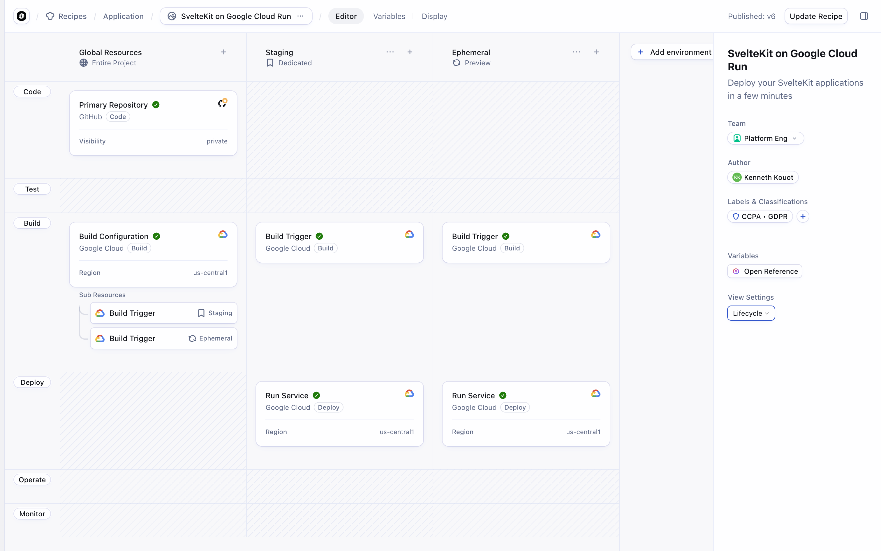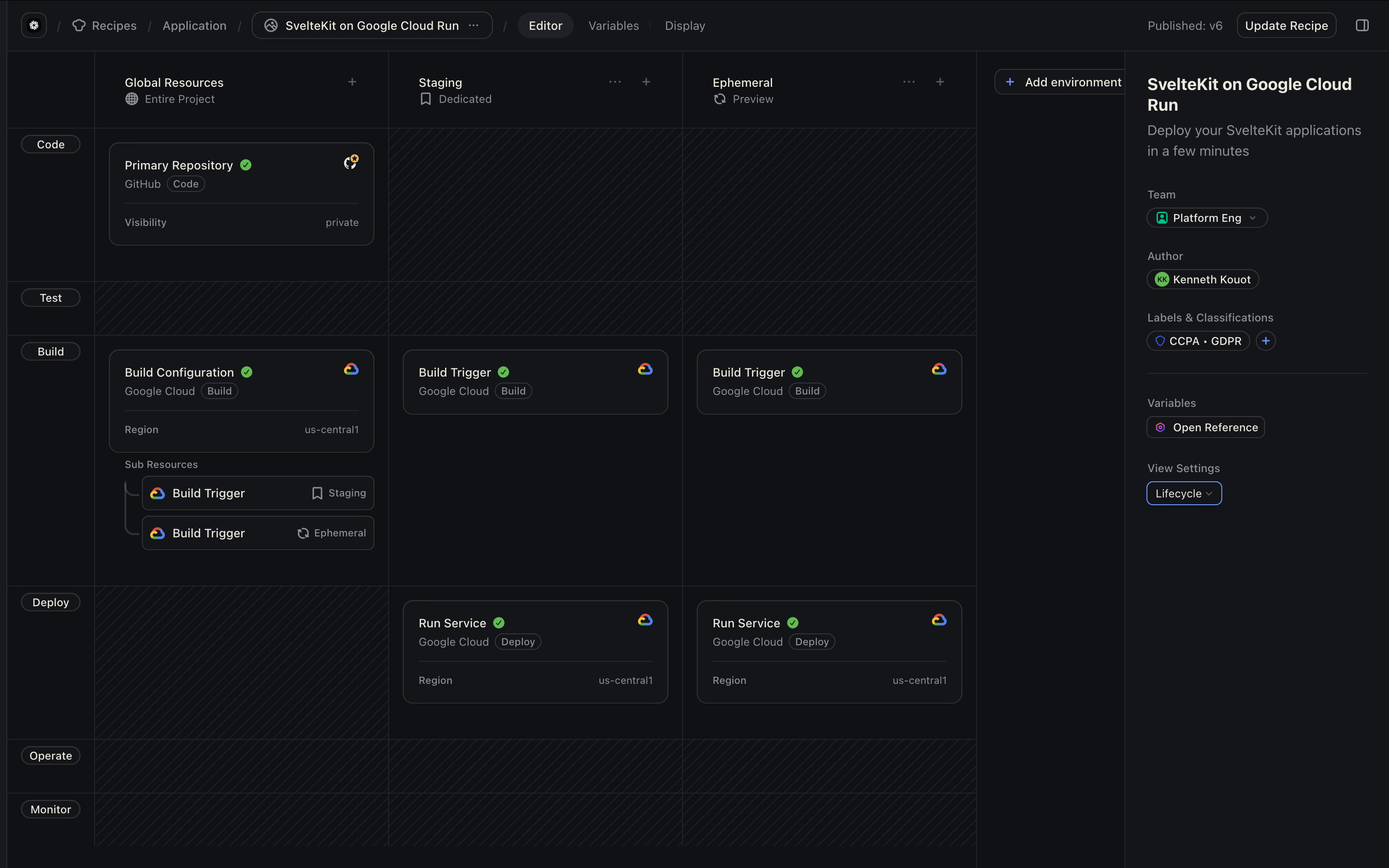 Application recipes are used to define how you want entire applications to be deployed. In today’s software environment, applications are networks of code, artifacts, infrastructure, services, and secrets that need to be deployed together. Tempest recipes allow you to easily define and deploy these applications. Application recipes are configured in your Tempest web console and the resources you can configure are based on the the your Tempest first-party apps and your own custom Private Apps.